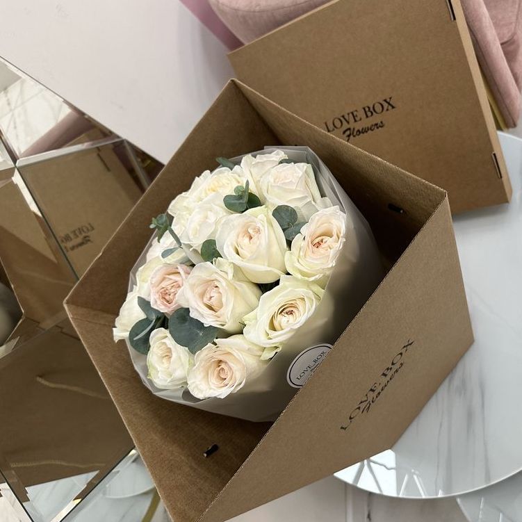 БУКЕТ ИЗ 15 ПИОНОВИДНЫХ РОЗ WHITE OHARA С ЭВКАЛИПТОМ