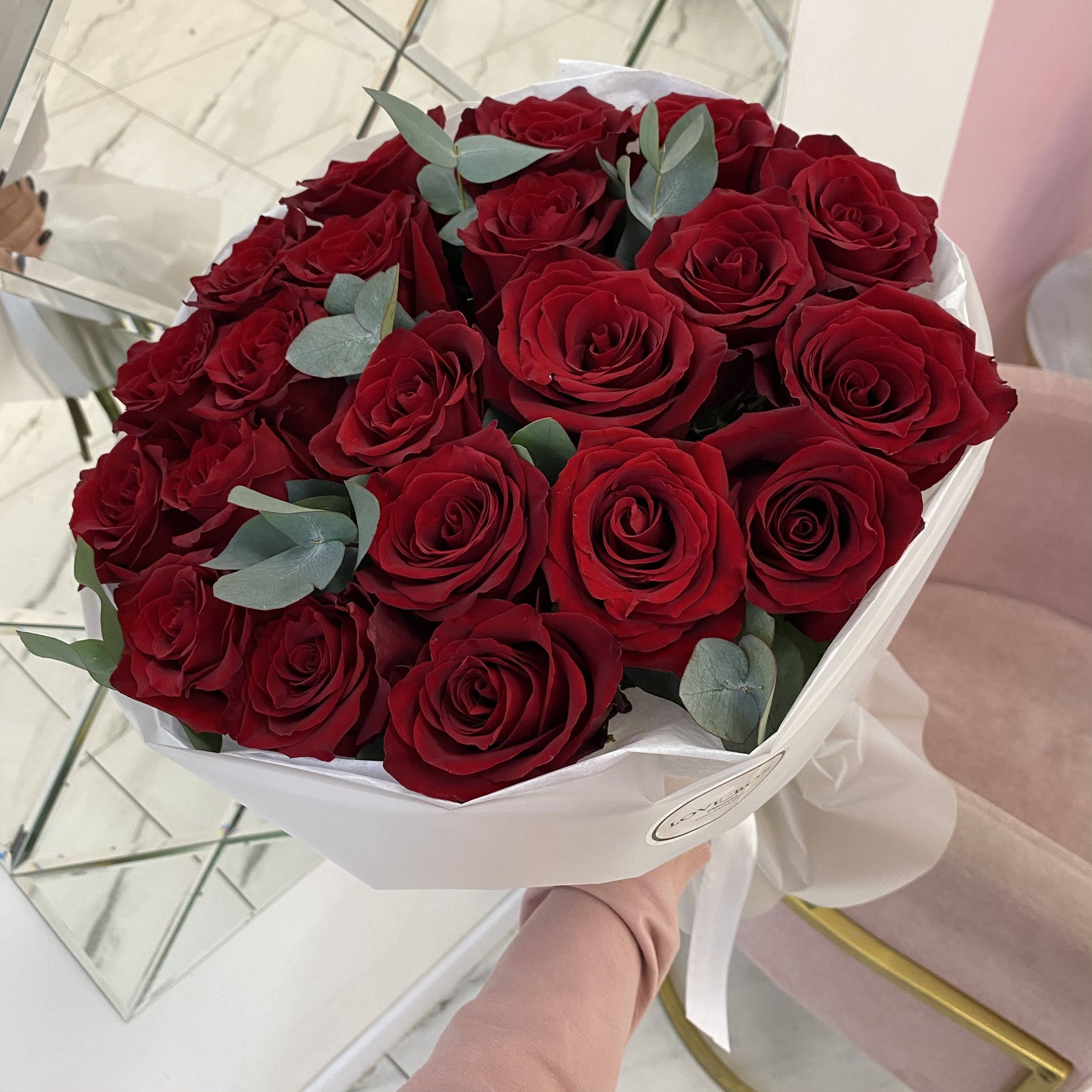 БУКЕТ ИЗ 21 КРАСНОЙ РОЗЫ С ЭВКАЛИПТОМ