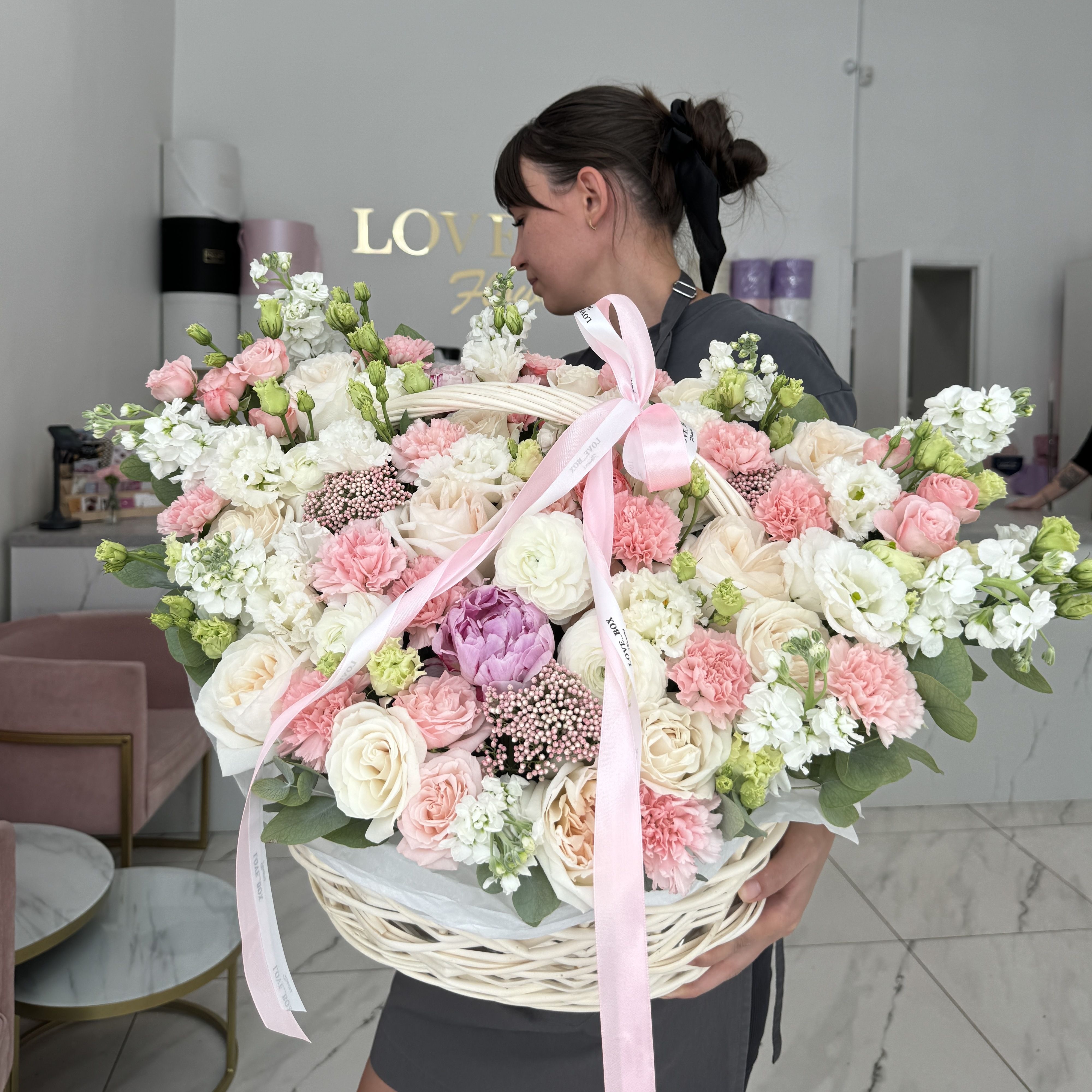 Пионы и ранукулюсы при наличии (зависит от сезона)