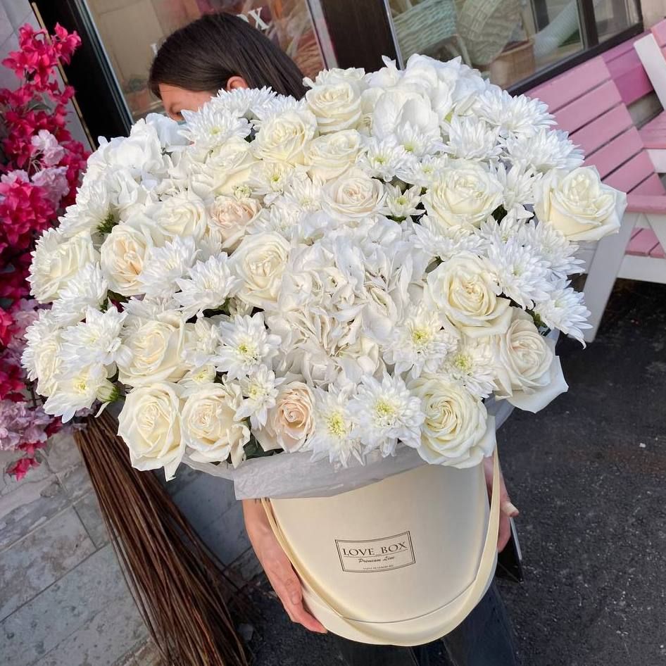 Букет в шляпной коробке микс цветов MAXI №3