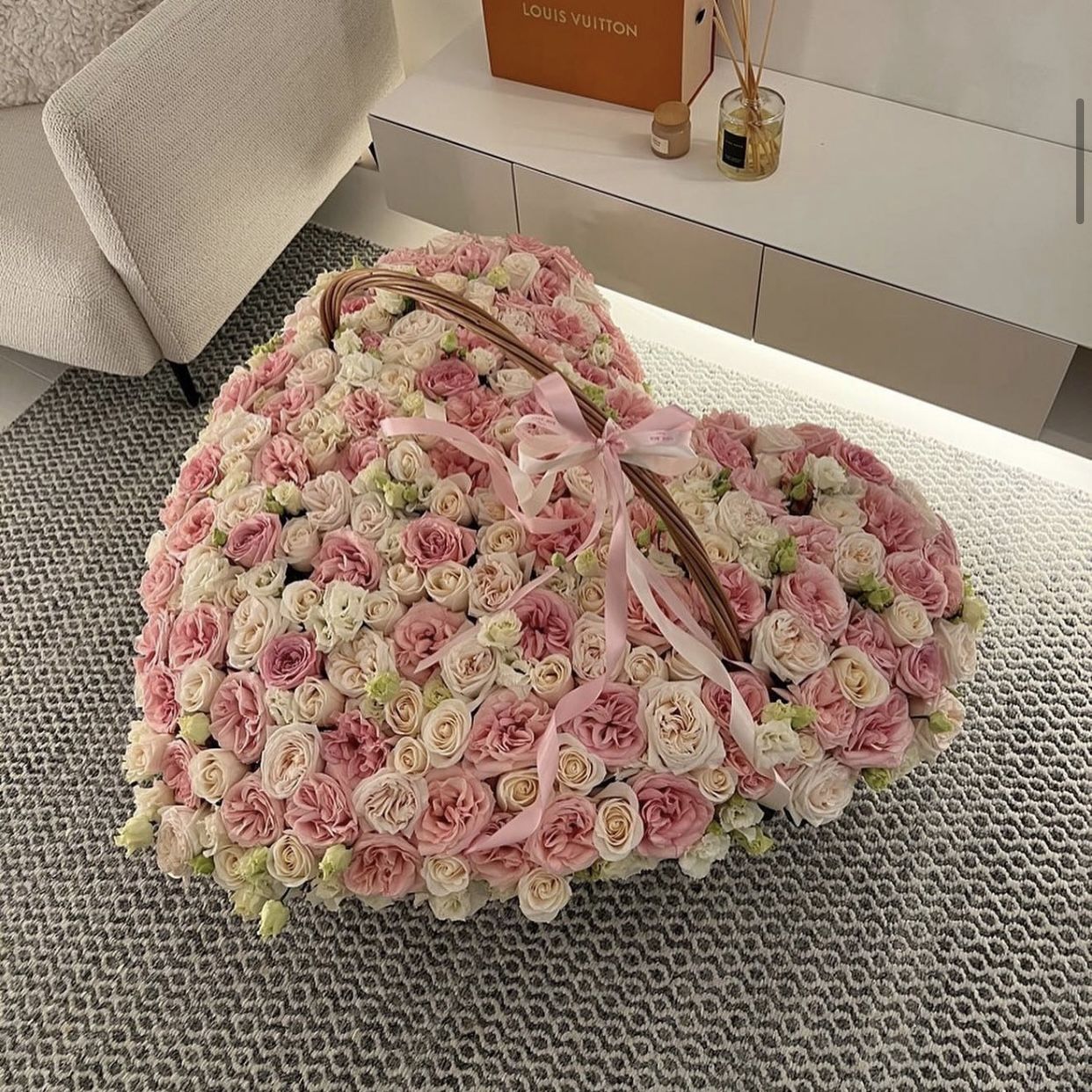 КОРЗИНА СЕРДЦЕ С ПИОНОВИДНЫМИ РОЗАМИ